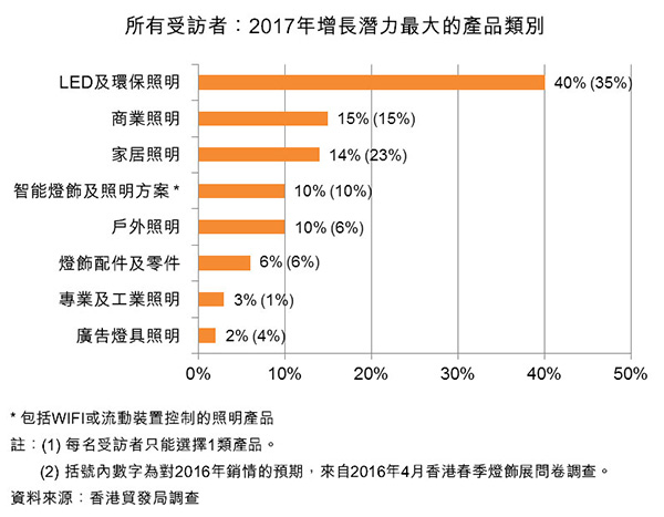 在10月進(jìn)行的調(diào)查中,最多業(yè)者認(rèn)為LED及環(huán)保照明是2017年增長潛力最大的產(chǎn)品類別,獲40%受訪者選擇。LED照明中,被視為增長潛力最大的主要應(yīng)用領(lǐng)域為室內(nèi)家居照明、智能照明系統(tǒng)以及室內(nèi)辦公室及商業(yè)照明,分別獲32%、21%及14%受訪者認(rèn)同。