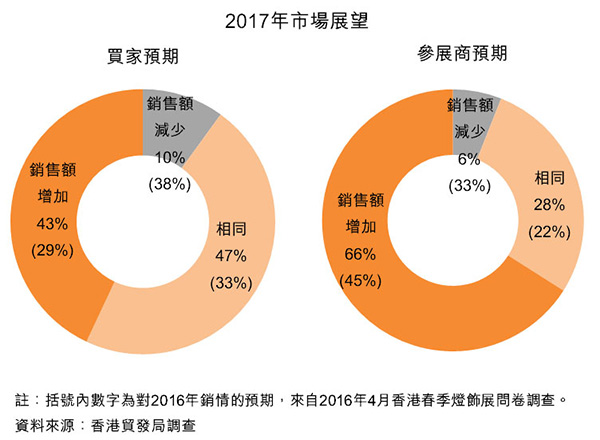 在秋季燈飾展上,43%受訪買家及66%受訪參展商預(yù)期2017年的銷售額較2016年有所增加。值得注意的是,這個比率較今年4月同一展覽的調(diào)查結(jié)果顯著上升。至于預(yù)期明年銷售額減少的受訪者比率則有所下降,分別僅占受訪買家的10%和參展商的6%。整體來說,縱然今年燈飾業(yè)銷售表現(xiàn)平平,但業(yè)界對2017年市場前景頗感樂觀。