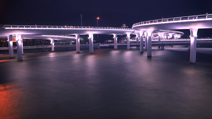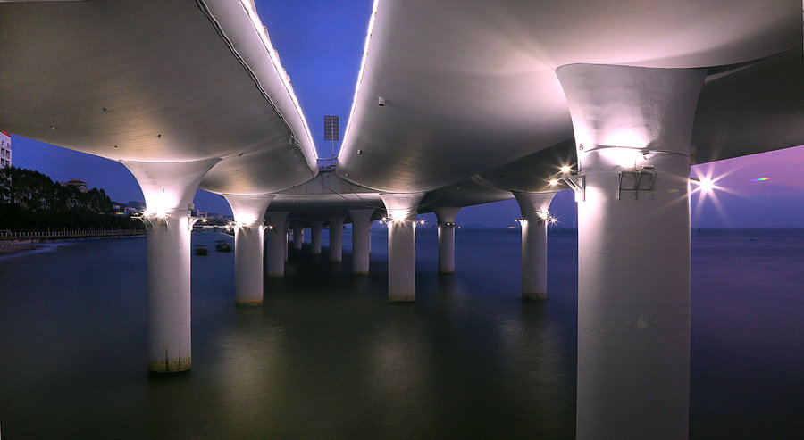 為了避免影響沿海景觀,橋梁照明采取附設(shè)在橋梁護(hù)欄上的照明燈而不設(shè)燈桿。由于演武大橋低橋位段的橋面標(biāo)高只有5米,被認(rèn)為是目前世界上離海平面最近的橋梁。