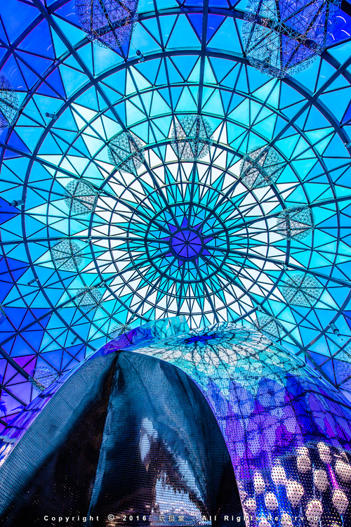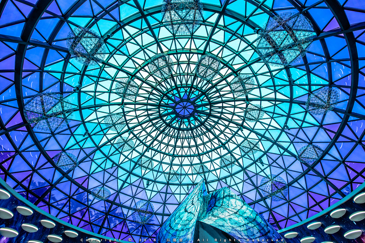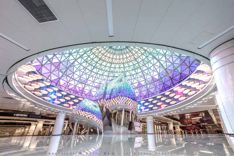 這座地鐵站的頭頂,是直徑21米的漸變藍色玻璃穹頂,陽光穿透,像一朵綻開的藍蓮花。在地面上看,它是一顆巨大的晶瑩藍色水晶球,像巴黎盧浮宮露出地面的玻璃金字塔。954塊鋼化玻璃制成,雙層玻璃里注入氮氣,隔熱隔紫外線,能承受6500人同時站在上面。