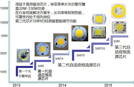 這種智能型LED恒流源徹底打破了教科書(shū)里描述的線性恒流源效率很低的常規(guī)認(rèn)識(shí),而破天荒地實(shí)現(xiàn)了99%的效率。從而可以實(shí)現(xiàn)把恒流源和光源放在同一塊鋁基板上,而做成光電一體化的光引擎。因?yàn)樗旧淼墓臉O低,所以把它放到光源的鋁基板上不會(huì)增加LED的結(jié)溫。深圳埃菲萊公司采用這種智能型恒流源已經(jīng)生產(chǎn)了一系列不同功率的光引擎: